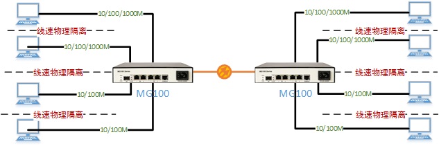 MG100综合业务千兆光端机点对点应用,实现2路1000M线速物理隔离以太网业务,2路100M线速物理隔离以太网业务同时在1条光纤上的点对点传输。